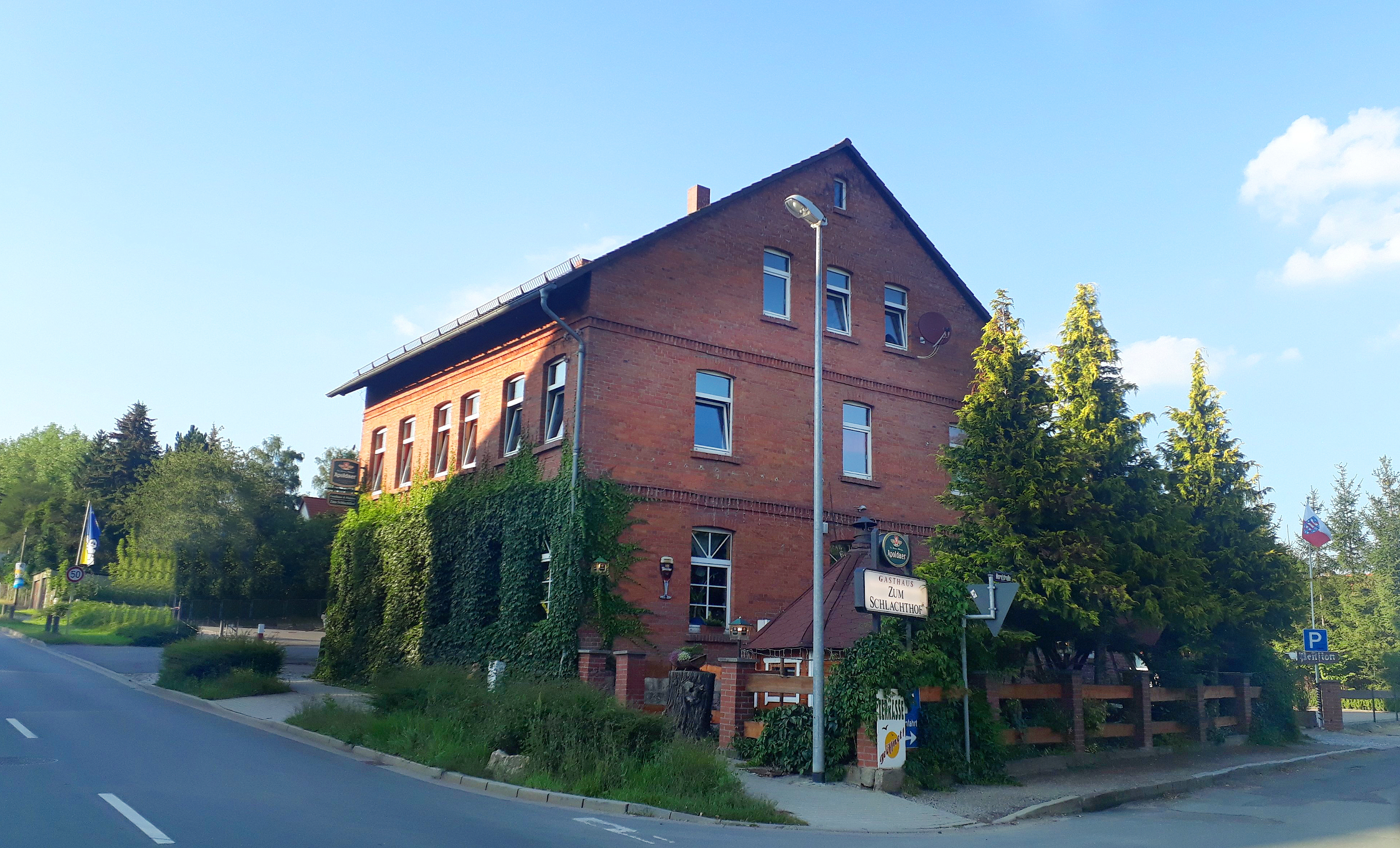 Der Bauherr Erwin Opel, gebürtiger Apoldaer und seiner Zeit Fleischermeister, beherbergte schon vor über 125 Jahren hier seine Gäste. Im April 1895 eröffnete er diese Gaststätte. Damals bewirtschaftete er noch Stallungen und lockte seine Gäste aus Nah und Fern mit Schlachtfesten und Speisen aus eigener Produktion an. Bis auf einige bedingte Schließungen und die dadurch wechselnden Gastwirte ist dieses Haus immer Gasthaus geblieben.